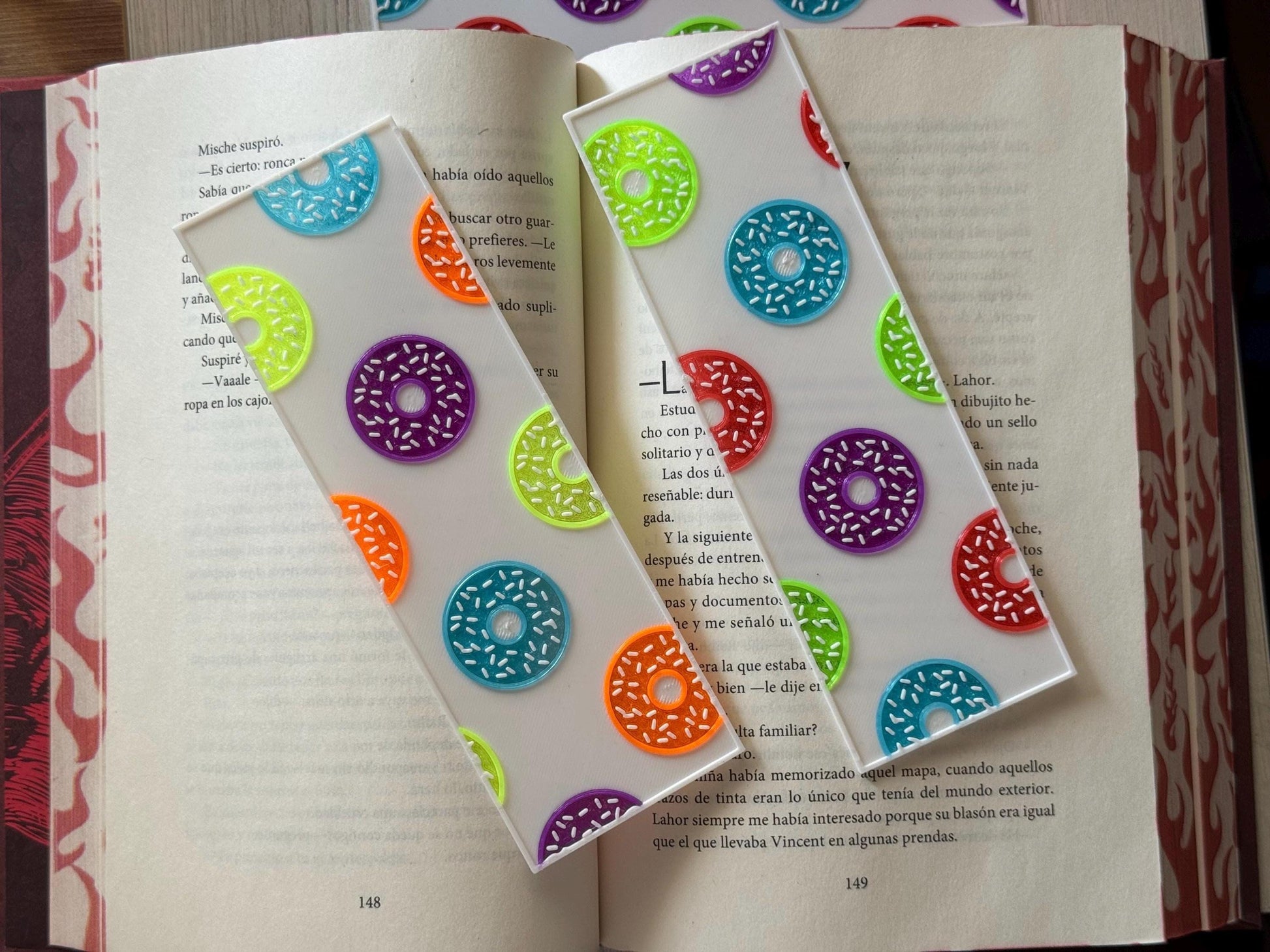 Add a touch of color and charm to your books with this stained glass–inspired donut bookmark! 3d printed made with vibrant and translucent pla, it captures the look of real stained glass while staying lightweight, sturdy, and oh-so-cute.